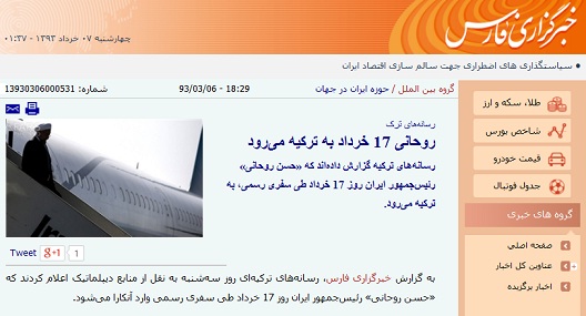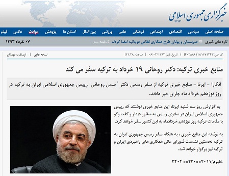 ترکیه آنلاین: عصر روز گذشته خبرگزاری فارس (وابسته سازمان بسیج) در ساعت 18:29 از سفر دکتر روحانی به ترکیه در تاریخ 17 خرداد خبر داد اما در ادامه، خبرگزاری دولتی ایرنا در ساعت 21:38 زمان سفر رئیس جمهور کشورمان به ترکیه را 19 خرداد اعلام کرد.